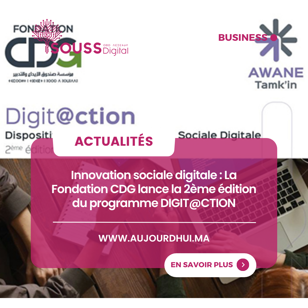 Dans le cadre de son engagement en faveur du développement social et de l’innovation numérique, la Fondation CDG lance l’appel à projets DIGIT@CTION, visant à renforcer les capacités digitales des associations marocaines et à soutenir l’émergence de solutions numériques innovantes au service de l’impact social. Ce dispositif a pour objectif d’accompagner des structures à but non lucratif qui œuvrent pour l’amélioration de l’impact social de leurs actions à travers la mise en place de solutions digitales innovantes. Dans ce cadre, 12 associations seront présélectionnées, à raison d’une par région. Elles participeront à un bootcamp d’une journée, suivi d’un hackathon de deux jours dédiés à la co-création et au prototypage des solutions proposées. À l’issue de ce parcours, trois projets seront sélectionnés pour bénéficier d’un accompagnement technique et d’un soutien financier mobilisé par la Fondation CDG avec son partenaire DXC-CDG.